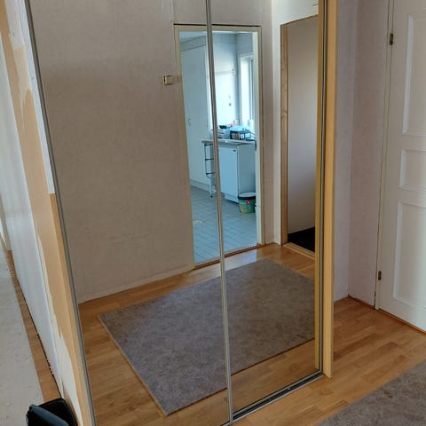 Toinen liukuovi on beige lasi ja toinen kirkas lasi.