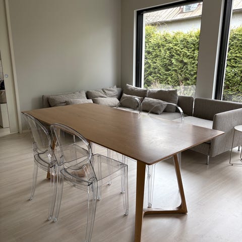 Kaunis valkolakattu tamminen täyspuinen ruokapöytä. Ostettu aikanaan suoraan Kave Homen sivuilta. OVH 1340€. Virheettömässä kunnossa.