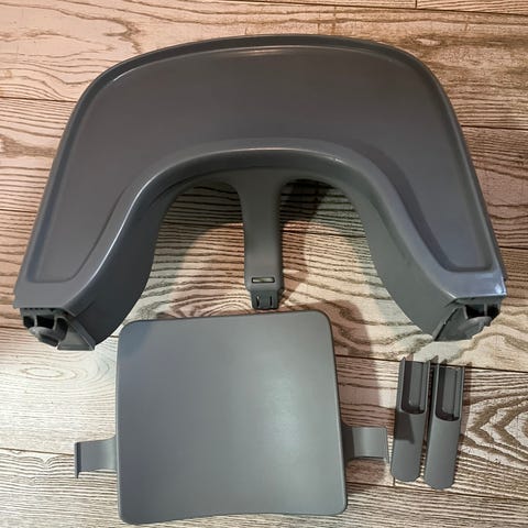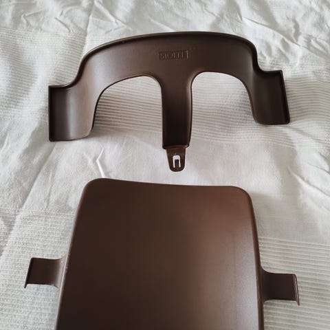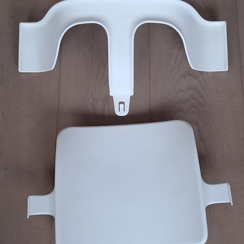 Myydään vaaleanharmaat Stokke Tripp Trapp syöttötuolin etukaari ja selkänoja (baby set).
