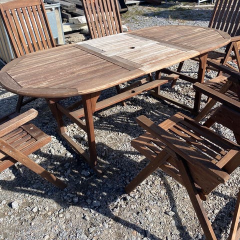 Myydään muovinen puutarhapöytä neljällä tuolilla. Tuoleissa käsinojat ja pöytä on kevyt siirtää.