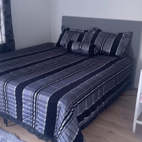Sotkan sänky patjalla ja korkealla tummalla päädyllä. Mukana leveä parisänkykokoinen runko