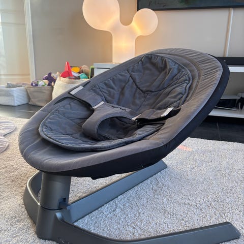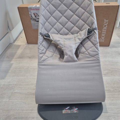 BabyBjörn sitteri, vaaleanbeige päällinen tikatulla kuviolla. Kolmipistevaljaat ja metallirunko, selkänojaa voi säätää takaa.