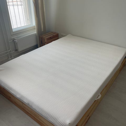IKEA:n puinen sängynrunko, koko noin 140x200 cm. Mukana sälepohjat (ei kuvassa). Sänky on osissa. Maksu käteisellä tasarahana tai mobilepaylla.