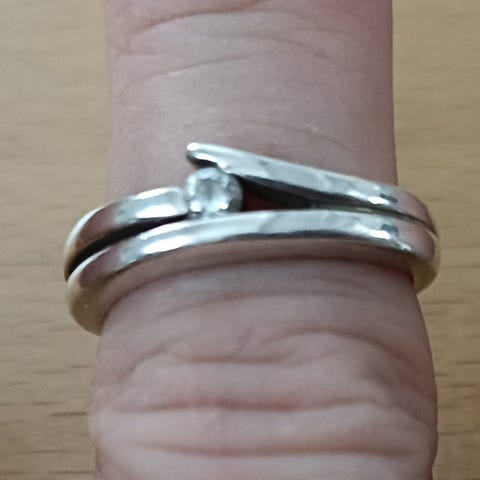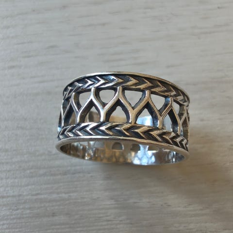 Hopeinen sormus, jossa on avoin geometrinen, kreikkalaistyylinen kuviointi. Sormuksen pintaa koristaa hienojakoinen teksturointi.
