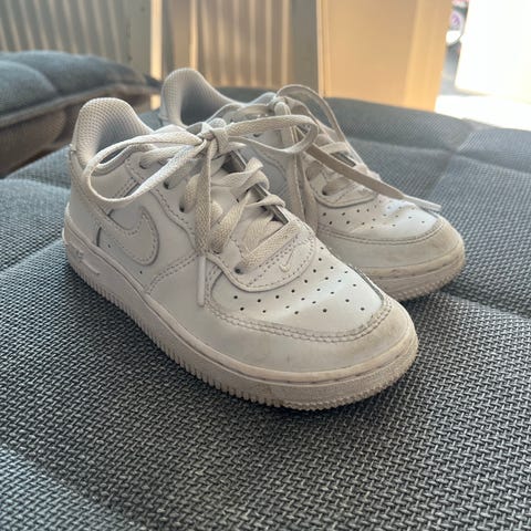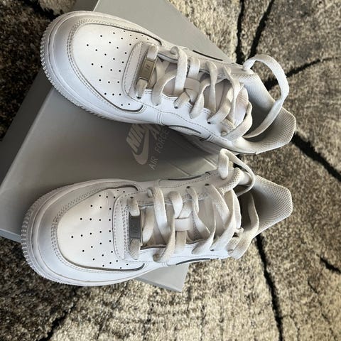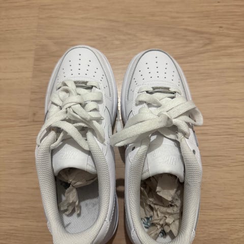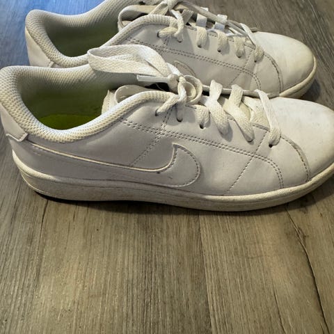 Nike lasten tennarit koko 36, valkoiset nauhoilla. Päällinen nahkajäljitelmää ja rei’itetty kärki, sisällä pehmustettu varsi ja Nike-pohjallinen.
