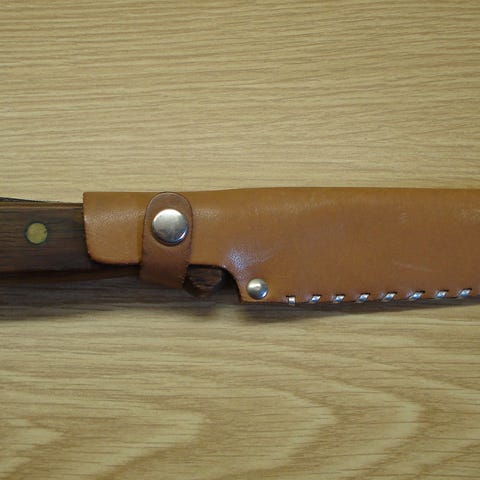 Käyttämätön fileerausveitsi ja kalan paikallaan pysymispiikki niille tehdyssä nahkakotelossa, upassa kotelissa.