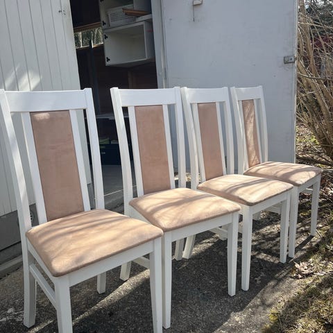 Valkoinen runko, harmaa, pehmustettu istuinosa. Jämäkät, siistit tuolit. Vain nouto. Kaikki 4 yhteishintaan.