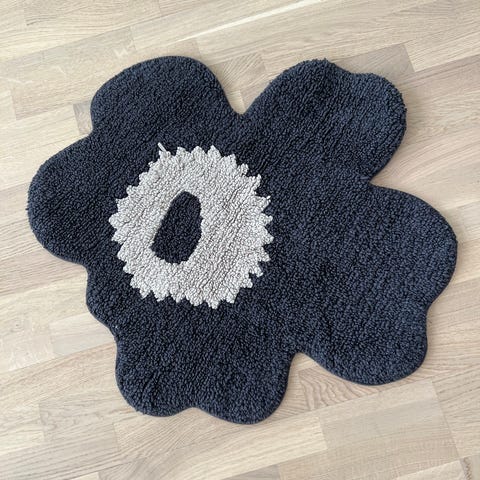 Marimekko Unikko Terry wc/ kylpyhuoneen matto tummanharmaana, vaalea kukkakuvio keskellä. Koko 73x74 cm. Konepestävä, pehmeä, täysin käyttämätön matto. Myydän koska se hukkui mustaan lattiaan. Ovh.82€
