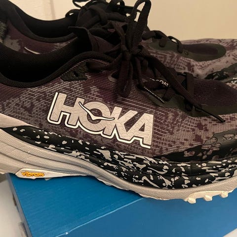 Myydään vähän käytetyt miesten Hoka Speedgoat 7 Wide -polkujuoksukengät.