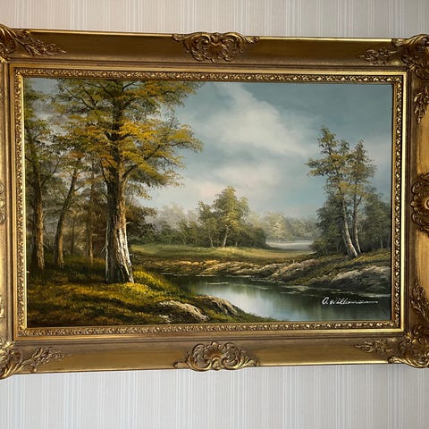 Kaunis maisemataulu leveillä kultakehyksillä. Kunnossa ei ole moittimista.