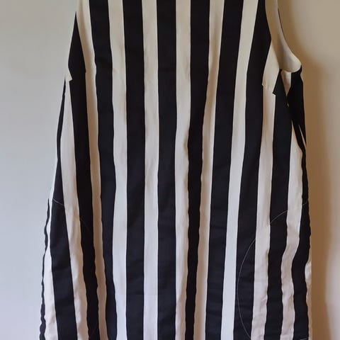 Erittäin hyvä käytetty kunto. Mustavalkoinen. Vahvempaa puuvillaa päältä, liukas vuori sisällä. Kai-kai 47cm; olka-helma 88cm. Vastaa kokolapun kokoa 38. Kangas ei jousta. Tilava A-linja. Kätevät taskut sivuilla. Eläimetön & savuton koti. Nouto Oulun keskustasta tai postit 9e/ Collect in Oulu centre or postage