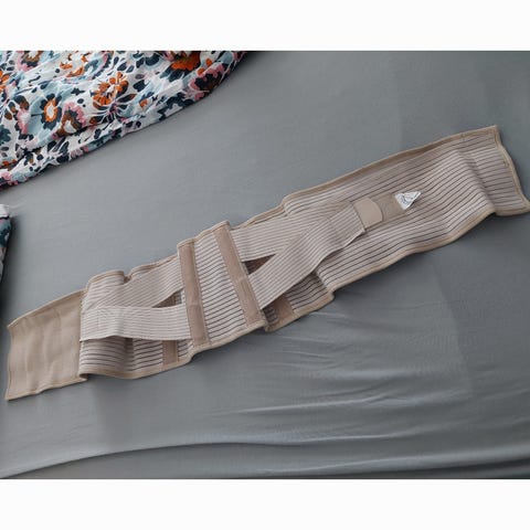 RO+TEN merkkinen musta selkätuki. Vyön koko L. Tarrakiinnitykset on tuessa etupuolella. Molemmista kyljistä lähtee neljä leveää kuminauhaa mitkä yhdistyvät edessä kahdeksi tarrakiinnitteiseksi kiristysnauhaksi. Tuessa on hyvät säätövarat. Tolle noin S koon mallille vyö on kyllä liian iso, mutta sain kuitenkin tuen pysymään päällä kuvauksen ajan. Tuki menee mallilla edestä turhan paljon päällekkäin. Jollekin isommalle käyttäjälle on oikein hyvä. Hyväkuntoinen tukivyö. Vähän nukkaa on tullut tarroista kumilankoihin, mutta se ei toki haittaa käyttöä mitenkään. Tämä on tosi leveä tukivyö.