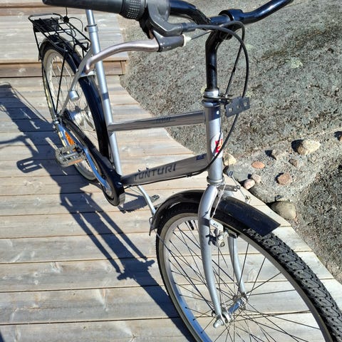 Naisten musta kaupunkipyörä, runkokoko L ja 26" renkaat. Edessä kori ja takana tavarateline, lokasuojat molemmissa päissä.