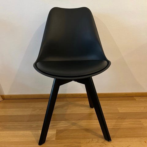 Kaksi Maskusta ostettua keinonahkaista ruokailutuolia.