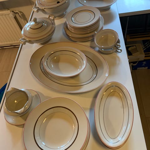 Arabian valkoinen kultareunainen astiasto. 6 syvää lautasta, kaksi vatia, kastikekaadin ja kannellinen (keitto) astia. Kultauksessa paikoin kulumaa. Vain nouto Pakilasta, käteinen tai MobilePay