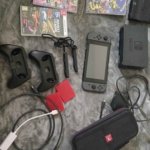 Myydään Nintendo Switch -konsoli punaisilla ja sinisillä Joy-Con-ohjaimilla. Mukana latausteline, säilytyskotelo, kaikki alkuperäiset ohjaimen osat, kaksi rattia ja pari peliä (Mario Kart Deluxe 8 ja Switch Sports).