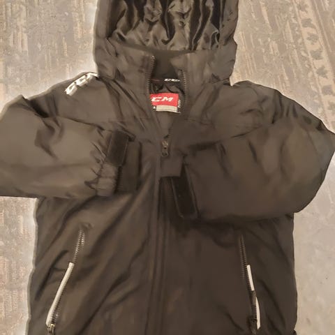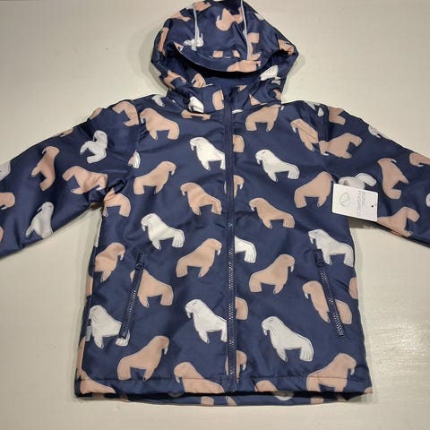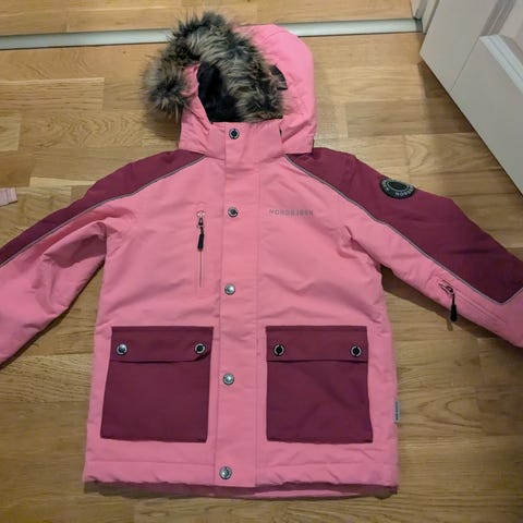 Karvahupullinen talvitakki koko 120. Hupun saa irrotettua. Hieman on käyttönukkaa resoreissa ja sisus paikkapaikoin "muhkuroilla", mutta toimiva ja lämmin takki vielä vaikkapa pihaleikkeihin. Ei ole untuvatakki.