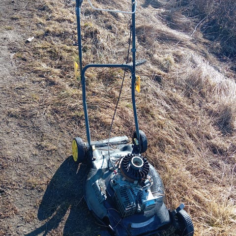 Vetävä ruohonleikkuri, en saanut talven jäljiltä käyntiin, ei jaksa tutkia. Hae pois