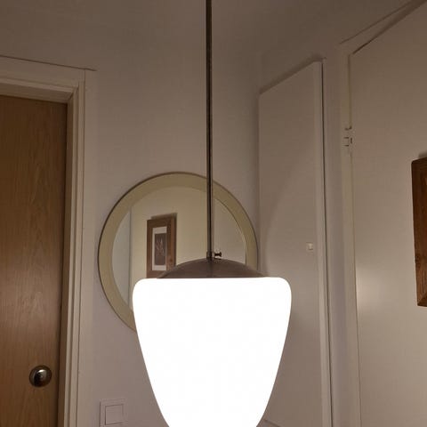 Vanhemman tuotannon Ornon kattovalaisin myytävänä. Toiminta testattu. Kuvussa kaksi pientä halkeamaa. Kupu akryyliä. Messingissä patinaa. Kuvun halkaisija 30 cm ja korkeus 27 cm.