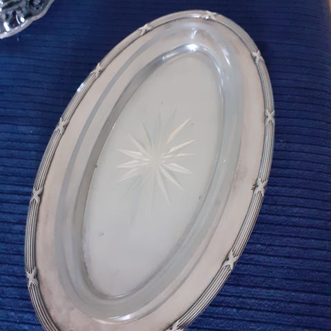 Metallinen tarjoiluvati mustalla kahvalla