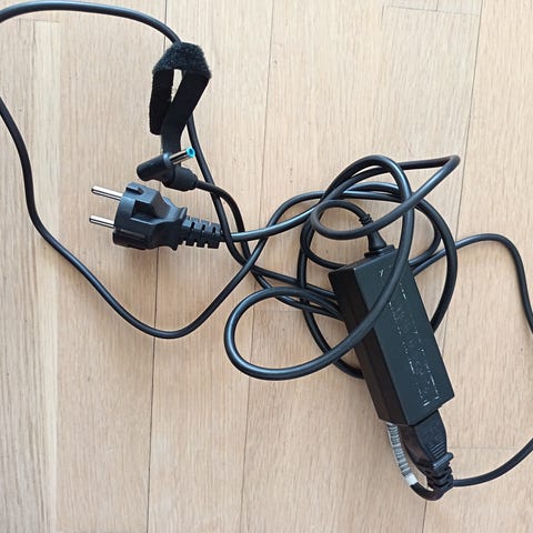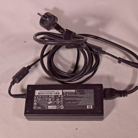 HP:n alkuperäinen kannettavan tietokoneen laturi johdon kanssa. Tarkemmat tiedot ja mallit näkyvät laturin tarrassa kuvissa.