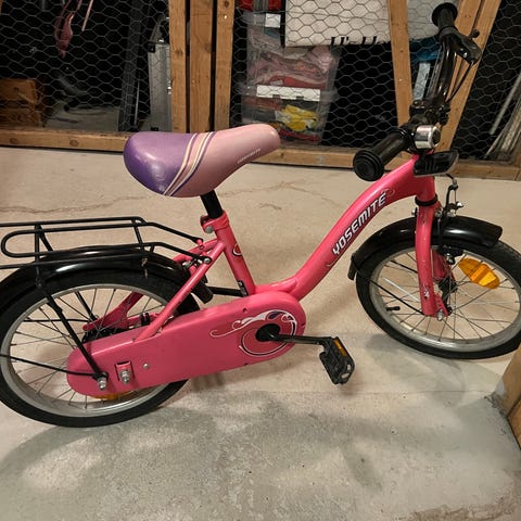 Helkama lastenpyörä 16" punaisena, hyvillä renkailla ja lokasuojilla. Pyörässä on tavarateline takana ja ketjusuoja edessä. Käytönjälkiä on, mutta tämä polkupyörä on tehty kestämään - kaikki toimii.