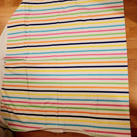 Oranssi, trikoo elastaanilla, koko leveys 150cm, pituus 70cm. Pesty pesukoneessa (kutistettu). Paino noin 200g/neliömetri.