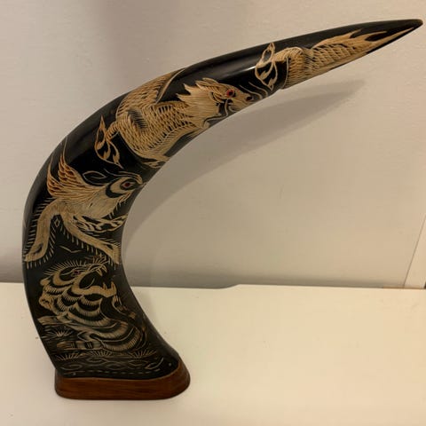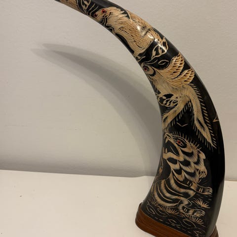 Käsin kaiverrettu koristeltu vesipuhvelin sarvi n.40cm korkea. Pysyy tukevasti pystyssä eli voi pitää kuin patsas esillä. Ei toridiiliä, en tingi. Nouto tarkka aika etukäteen sovitusti ma-pe kl. 10-16 Hki 88 tai postitse pakettina
