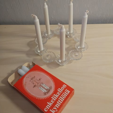 Vuosikymmeniä vanhat iki-ihanat kynttilänjalat, joihin sopivat pienet kuusenkynttilät. Ehjät ja siistit. Enkelin korkeus 14cm. Alkuperäinen pakkaus ehjä ja siisti.