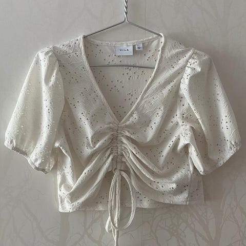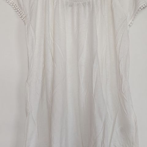 Valkoinen lyhyt t-paita. Paidassa ei ollut mitään lappuja kiinni. Tämä paita sopii hyvin jollekin s - kokoiselle pienelle naiselle. Kiva kietaisumallinen valkoinen t-paita. Kankaat on kuitenkin edestä vähän toisissaan kiinni niin kankaat pysyy hyvin oikeilla paikoilla. Tämä on siisti käytetty paita. Tästä jollekin käyttöön kiva lyhythihainen kietaisupaita. Kiva vähän erilainen t-paita. Hieno paita vaikka löysän villatakin kanssa käytettäväksi syksyllä.