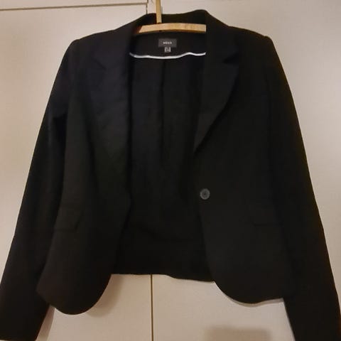 Kaunis pitkä musta jakku valkoisilla somisteilla kokoa 38.