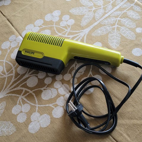 Monitoimi hiustenlaittolaite. Laite on toimiva ja siinä on pari pyöröharjapäätä, yksipiippauspää, puhallinsuutin ja hiusharjasuutin. Merkkiä Philips Chic 1000.