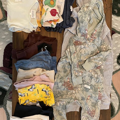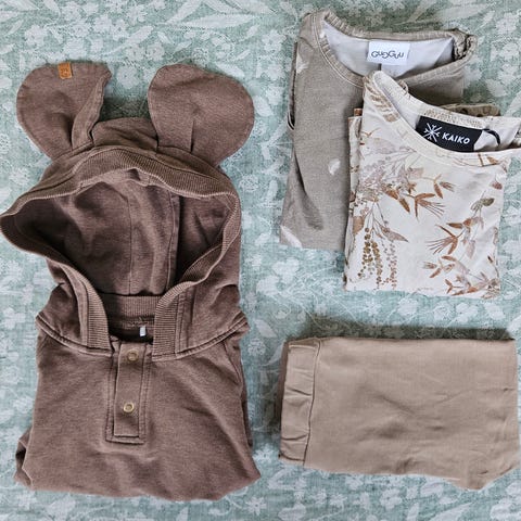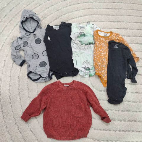 Vaatesetti kokoa 74, vaatepaketti kaikki hyväkuntoisia, kaiko body, gugguu frillamekko, newbie kukkaleggingsit