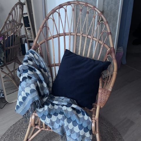 Siisti ja hyväkuntoinen design tuote. Yksi rima katki, jää pehmusteen alle rikä vaikuta kestävyyteen. Punokset pitäisi olla kaikki ehjiä ja lakkapinta hyvä.