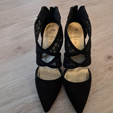 Naisten mustat kengät, koko 40, kapeahko lesti, 6 cm korkea korko, korkolaput hyvässä kunnossa, toisen kengän kärjessä pieni naarmu..