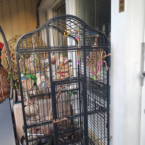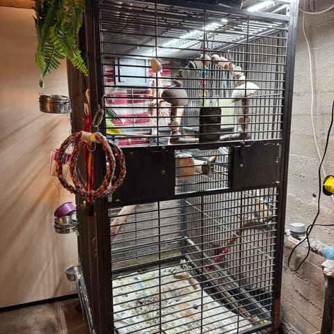 Yhdellä linnulla ollut suuri häkki jossa useita luukkuja ja mm. katolta luukut aukeavat ja niiden väliin voi virittää orren. Pyörät alla. Ulosvedettävä pohja. Tosi kiva häkki