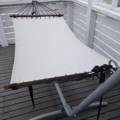 Ikean Swinga riippuva istuin niin sisä- kuin ulkokäyttöönkin. Ollut ulkona. Käytönjälkiä, mutta menee vielä.