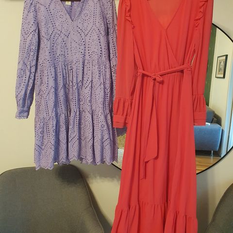 Mekossa leveä, hulmuava helma. V-pääntie, jossa napit. Napinlävet hieman löysät.