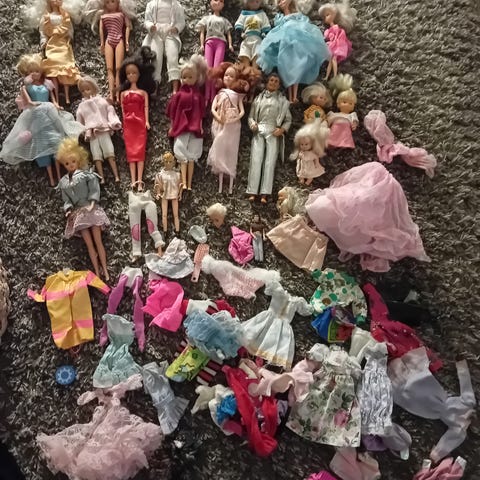 Barbit: 1. Made in China. Pieniä värivaurioita. Puku myyty. 2. Made in Hong Kong. Parturoitu. Puku ok. 3. 1999 Mattel inc. CHINA. Puku erinomainen. 4. Made in Hong Kong. Kunto surkea. Käsi puuttuu. Puku hyvä, mutta nappi puuttuu. Tarjoa!