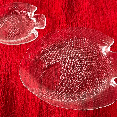 Kalalautasia,-tarjoiluastioita setti, 6+1, metalli, lasi, yht.hinta