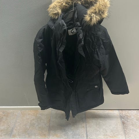 Vähällä käytöllä ollut siniharmaa takki. Karvareuna irrotettavissa hupusta. Paljon toimivaa kiinnitystarraa ja vetoketjuja. Muutenkin kauttaaltaan täysin ehjä.