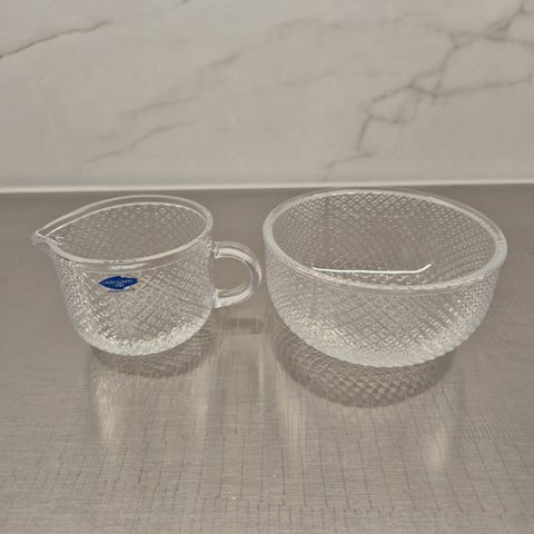 Suunnittelija on Kerttu Nurminen. Myynnissä hyväkuntoiset ja täysin ehjät Nuutajärven Pauliina -sarjan - kermakko ja sokerikko. Kermakon sisäreunassa hiukan karheumaa, ei lohkeamia. Molempien osien korkeus on 6 cm, sokerikon suuaukon halkaisija on 11 cm ja kermakon 7,5 cm. Hinta 15 euroa on yhteishinta molemmille.
