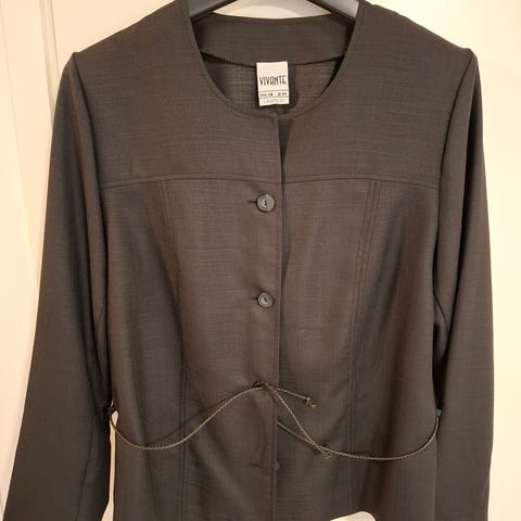 Vähän käytetty tummansininen jakkupuku koossa 34. Housut ja takki. Kissatalous, mutta kissat ei hengaile vaatehuoneessa.