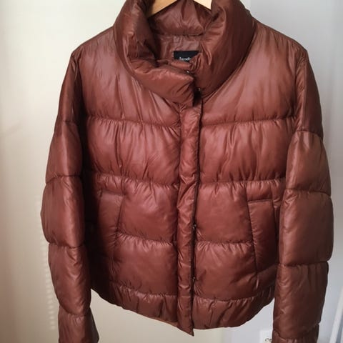 Musta kiiltäväpintainen, lämmin, lyhyt toppatakki korkealla kauluksella ja taskuilla. Haltijasta helmaan pituus 50cm