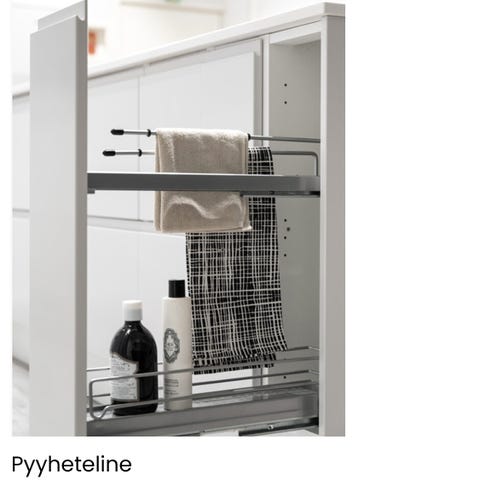 Keittiön tyylikkääseen viimeistelyyn kuivauskaapin näyttävä ruostumaton ritiläsetti 500 mm leveään kaappiin. Kiinnitys kaapin runkoon kiinteillä 5 mm jousellisilla tapeilla.