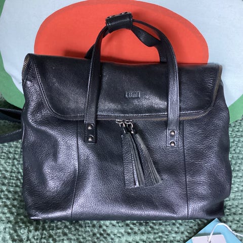Käsilaukkukokoa oleva Lumin musta nahkareppu. Käyttämätön. Sisus kirkkaansininen. Sisällä vetoketjullinen tasku.