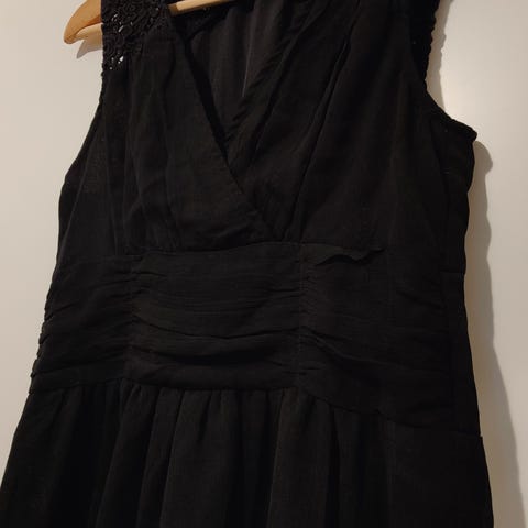 Musta - valkoinen raidallinen mekko. Kaunis mekko pitsikauluksella ja helmillä. Mekossa ei ollut mitään kokolappuja, mutta ainakin xs- kokoiselle menee reilusti päälle. Luulisin, että tämä on hyvä mekko s tai m koolle riippuen kuinka löysästä tykkää. Itselle ainakin jää tosi löysäksi yläosasta, että kasvuvaraa olisi vielä hyvin. Mekossa on vähän vajaamittaiset pitkät hihat. Joustava paksu kangas. Tämä mekko on pituudeltaan reisille asti tuleva. Hyvässä käytetyssä kunnossa oleva mekko. Kauluksessa on koristeena kaunis pitsi. Kauluksessa on myös nättejä helmiä koristeena. Yksi helmi ilmeisesti puuttuu mekon pitsikauluksesta.
