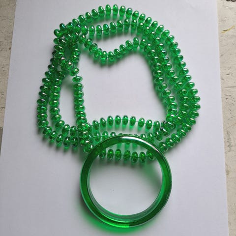Oikealla vaaleansinisillä helmillä ja isolla pyöreällä simpukalla kaulakoru. Nämä 6e kpl