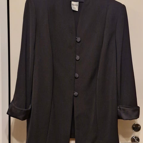 Kotimainen, vuoriton jakku. Sivusaumoissa taskut, kevyet olkatoppaukset. Kokolapun koko 46, mutta Tricanan vaatteet ovat väljiä mitoitukseltaan. Kainalomitta 66cm, kokopituus 76cm.