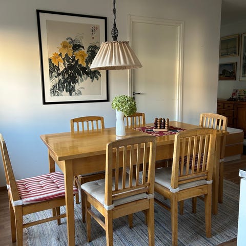 Antiikkinen, klaffilla jatkettava talonpoikaisruokapöytä ja 6 tuolia (tyynyt eivät sisälly.)